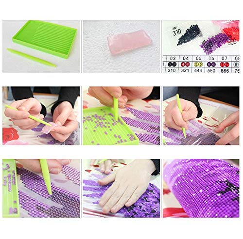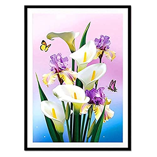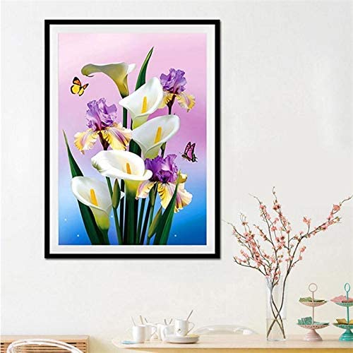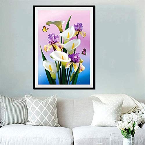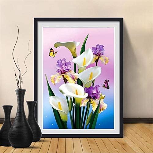 Al Adham - لوحة تزيين جدارية لديكور المنزل بطبعة زهور الزنبق وفراشات بنمط نقش وتطريز بوساطة قطع الماس يمكنك تركيبها بنفسك بغرز متقاطعة بتصميم خماسي الابعاد قياس 40 × 54 سم