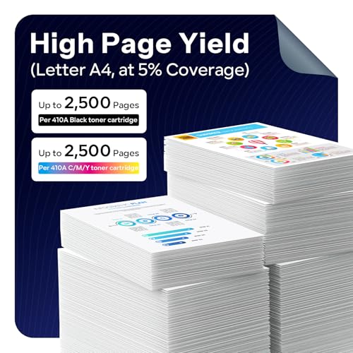 - يصل إنتاجية الصفحات لكل عبوة حبر ملون 410a إلى 2500 صفحة. (بناءً على تغطية تصل إلى 15%).