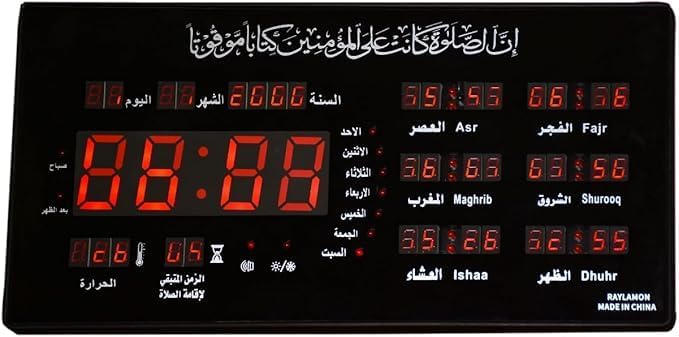 - شاشة LED رقمية: عرض واضح لمواقيت الصلاة الخمسة مع إمكانية رؤية التوقيت بسهولة في جميع الظروف