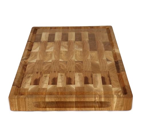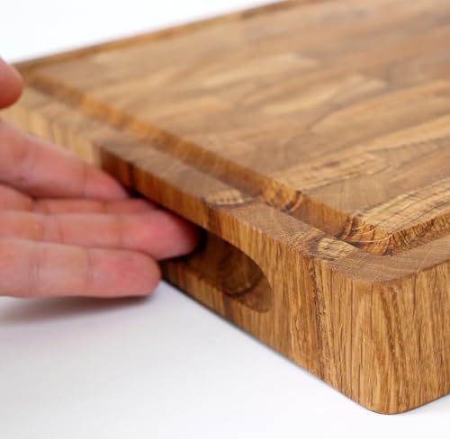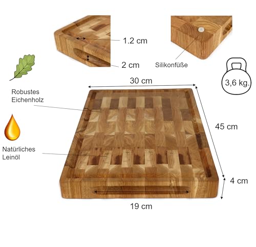 H&S - لوح تقطيع قوي ومتين مصنوع من خشب البلوط مضاد للبكتيريا مع مقابض وأرجل من السيليكون غير قابلة للانزلاق، مناسب للحوم والمطبخ، 45 × 30 × 4 سم