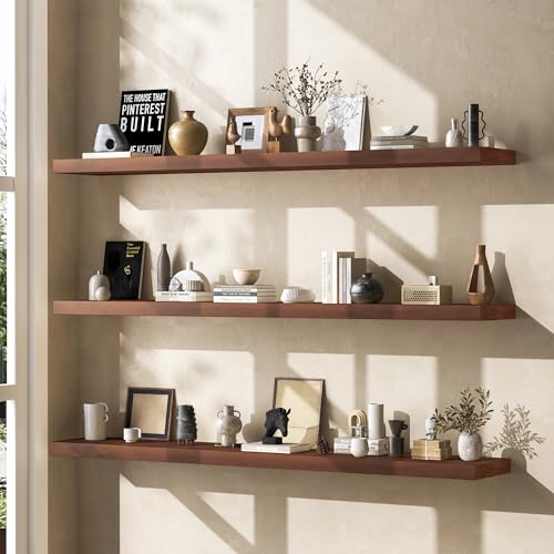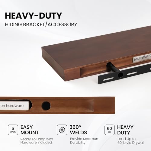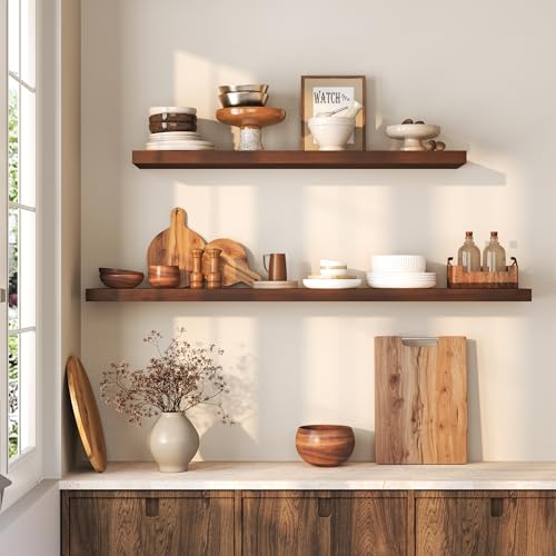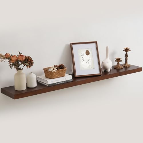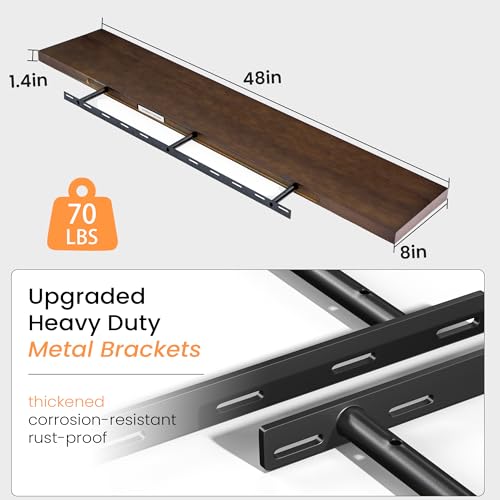 Fun Memories - رف عائم 48 انش لرف الموقد - رف حائط من خشب الصنوبر الصلب الريفي بعمق 8 انش - رف بنمط بيت المزرعة مع دعامات معدنية شديدة التحمل - عرض 48 انش × عمق 8 انش - خشب الجوز الامريكي، مجموعة من قطعة واحدة