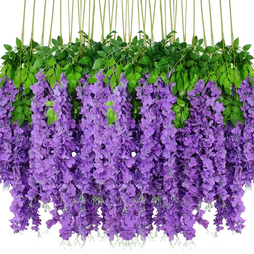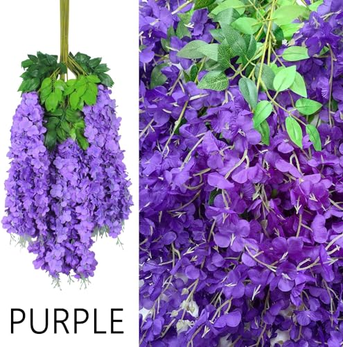 HanYun - طقم 48 قطعة من زهور الجهنمية الصناعية الكثيفة باللون البنفسجي بطول 3.6 قدم للقطعة مع شرائط تعليق من حرير للزينة المنزلية والحفلات والأعراس، بنفسجي كثيف