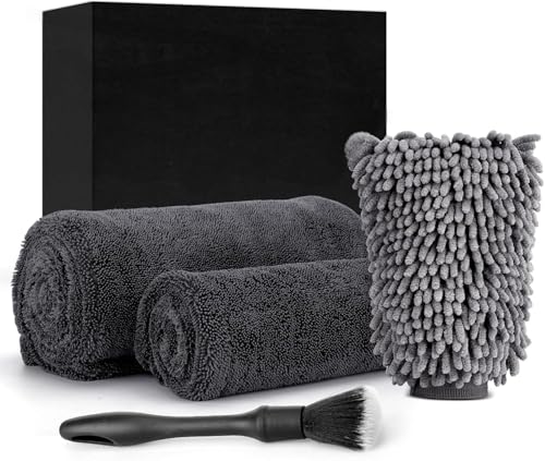 Idrese - مجموعة مناشف سيارة 4 في 1، 2 × منشفة تجفيف مايكروفايبر 1300 غرام لكل متر مربع، 1 × قفاز غسيل السيارة، 1 × فرشاة تنظيف السيارة