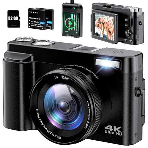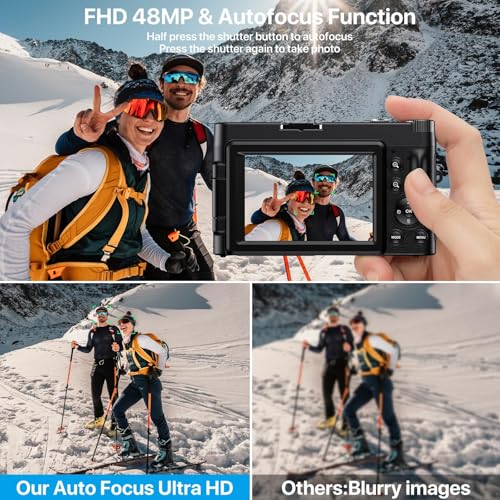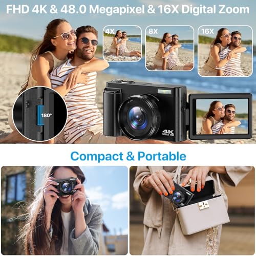 Generic - كاميرا رقمية 4K للتصوير الفوتوغرافي 48MP 4K مع بطاقة SD، شاشة قابلة للطي 180 درجة 3 انش لفيديو يوتيوب مدمجة مع تقريب رقمي 16X، مضادة للاهتزاز، بطاريتان