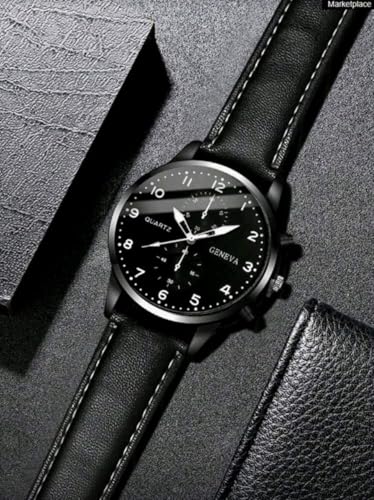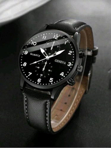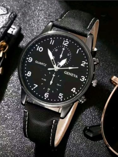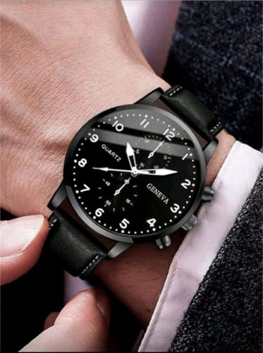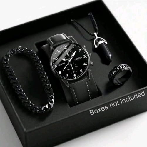 Generic - طقم ساعات كاجوال وعصري للرجال من 4 قطع، مينا دائري، علامات ارقام عربية، ساعة كوارتز بسوار من البولي يوريثين، تأتي مع قلادة وسوار وخاتم