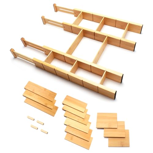 VANANA - مجموعة فواصل أدراج قابلة للتوسيع مع 12 قطعة إدخال، منظم أدراج المطبخ من خشب الخيزران قابل للتخصيص لتنظيم الأدوات، منظم أدراج المكتب وتنظيم أدراج الملابس، عبوة من 4 قطع (مقاس 43-56 سم)