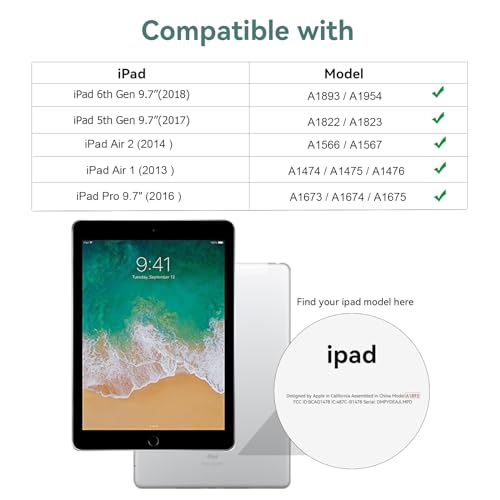 - التوافق: جراب يناسب آبل اي باد 9.7 مقاس 6 بوصة من 4 يو بون لايف. الجيل 2018 (رقم الموديل: A1893 A1954)/ لجهاز اي باد الجيل الخامس 2017 (الموديل: A1822 / A1823). مناسب أيضًا لجهاز اي باد اير 2 2014 (رقم الموديل: A1566 A1567) / اي باد اير 1 2013 (رقم الموديل: A1474 A1475 A1476)/ اي باد برو 9.7 بوصة 2016 (الموديل: A1673 ،A1674 ،A1675 ملاحظة: غير متوافق مع أجهزة اي باد السابقة الأخرى أو أي أجهزة أخرى).