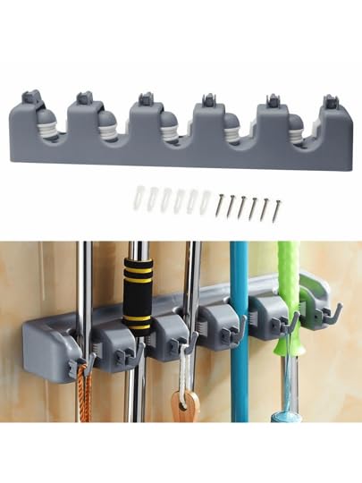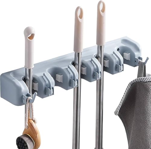 حامل مكانس خماسي – 5 عيون + هوكات جانبية – لتنظيم أدوات التنظيف والفوط والفرش – تثبيت على الحائط A