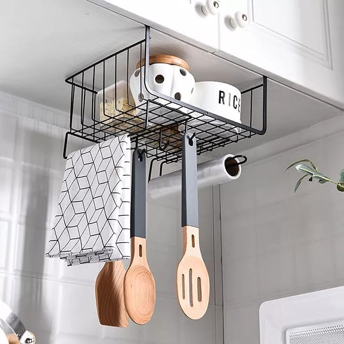 Generic - رف معدني متعددة الاستخدامات تثبت تحت الرف للتنظيم والتخزين في المطبخ بشماعة 5 هوك وحامل مناديل (RM - 431 )، ابيض