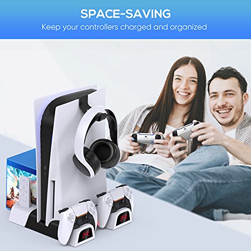FASTSNAIL - حامل عمودي 5 في 1 لـ PS5 و PS5 الإصدار الرقمي مع مروحة تبريد 3 مستوى قابل للتعديل ووحدة تحكم شاحن شحن سريع مع مؤشر LED و 2 حامل شماعات وجهاز تحكم عن بعد و 10 منظم أرفف ألعاب