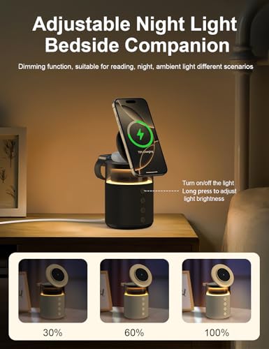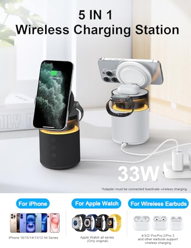 soyes - قاعدة شحن لاسلكية 5 في 1 لاجهزة ابل مع مكبر صوت بلوتوث، شاحن مغناطيسي مع ضوء ليلي، حامل شاحن مع محول 33 واط لسماعات ايربودز ايفون 16 15 14 13 12 برو ماكس ابل ووتش