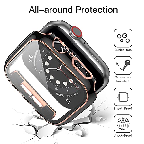 - [[تصميم مبتكر وحماية كاملة]: جراب متين من البولي كربونات مع تصميم حافة ملونة مطلية، أنيق وأنيق، خذ ساعتك بمظهر جديد وأصبح محور الموضة؛ جراب مدمج بشاشة حماية من الزجاج المقوى الشفاف عالي الدقة (والتي لا توجد مشكلة في اللمس)، يغطي كلاً من الشاشة والحواف، يحمي ساعة ابل الخاصة بك 360 درجة من الخدوش والصدمات والسقوط العرضي.