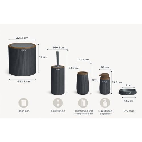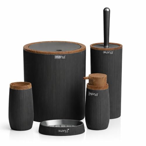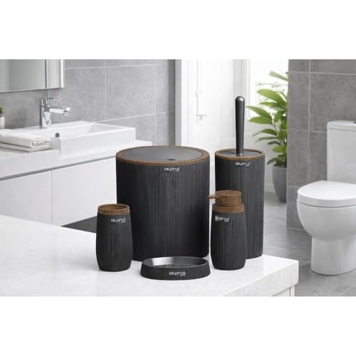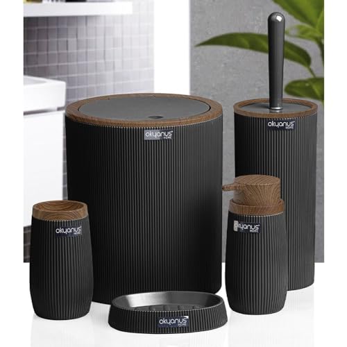 Generic - مجموعة اكسسوارات حمام من 5 قطع، تصميم مخطط حديث، بلاستيك متين مع لمسات خشبية الشكل، مع سلة مهملات وفرشاة مرحاض وموزع صابون وحوامل، بلاستيك، (اسود)
