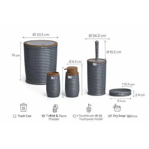 - مجموعة حمام كاملة مكونة من 5 قطع - تتضمن سلة مهملات وفرشاة مرحاض مع حامل وموزع صابون سائل وحامل فرشاة أسنان ومعجون أسنان وطبق صابون جاف لمظهر حمام متناسق تمامًا.