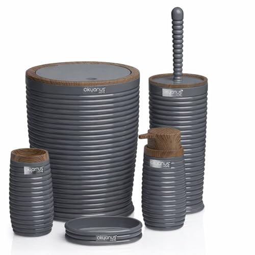 Generic - مجموعة اكسسوارات حمام من 5 قطع مع لمسة خشبية - تصميم مضلع عصري مع سلة مهملات وفرشاة مرحاض وموزع صابون وحوامل - ديكور حمام انيق (رمادي)
