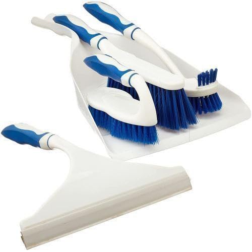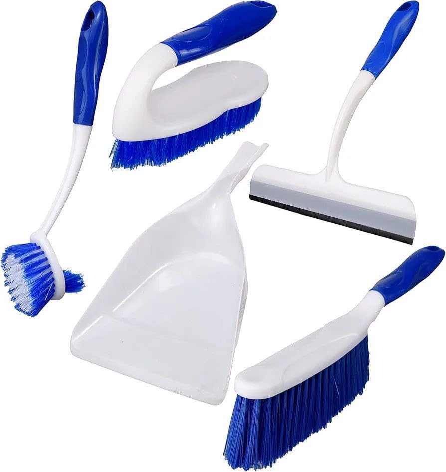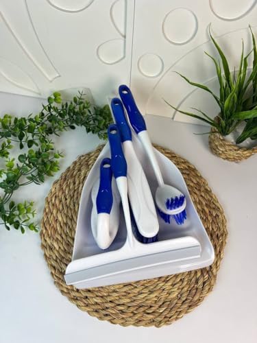 Generic - مجموعة تنظيف مكونة من 5 قطع مع جاروف ومكنسة وفرشاة سجاد وفرشاة صغيرة وممسحة للنافذة، ازرق وابيض، بلاستيك