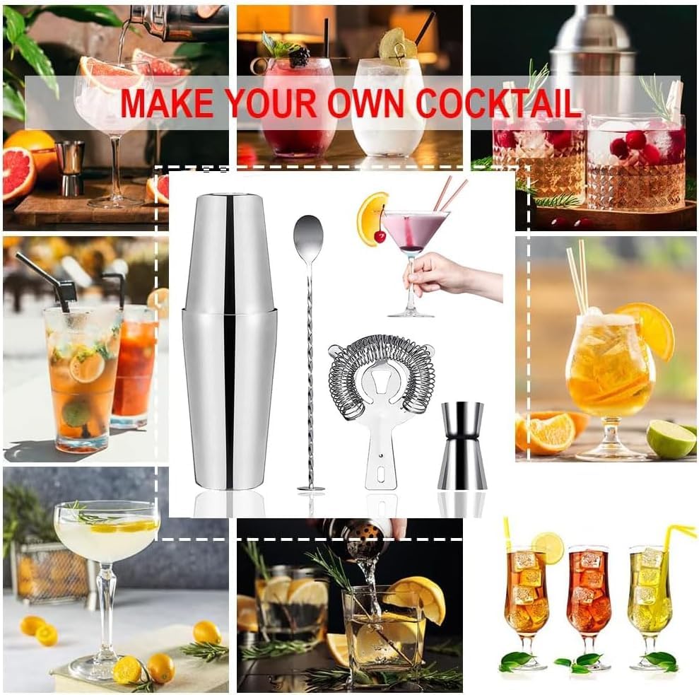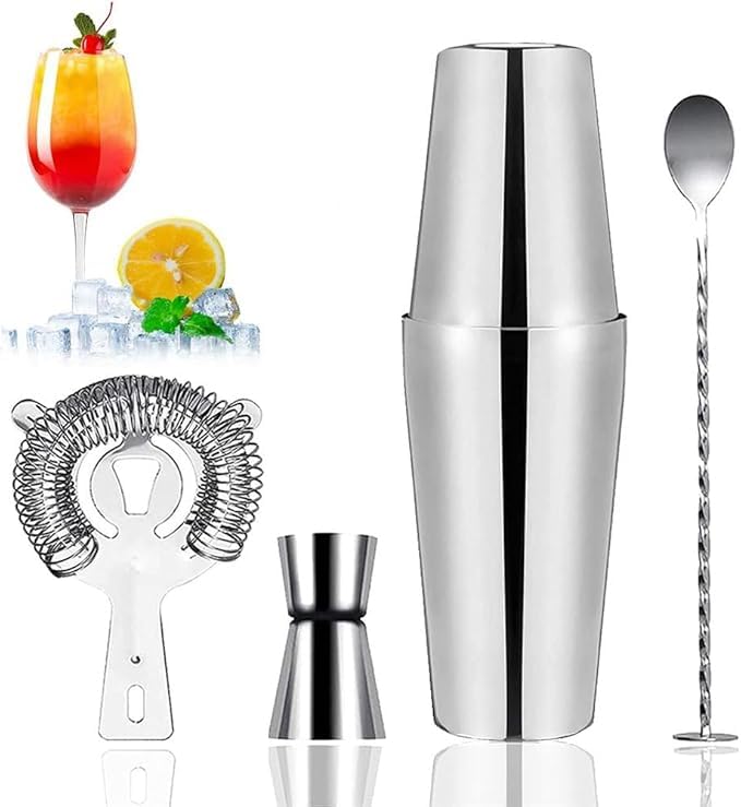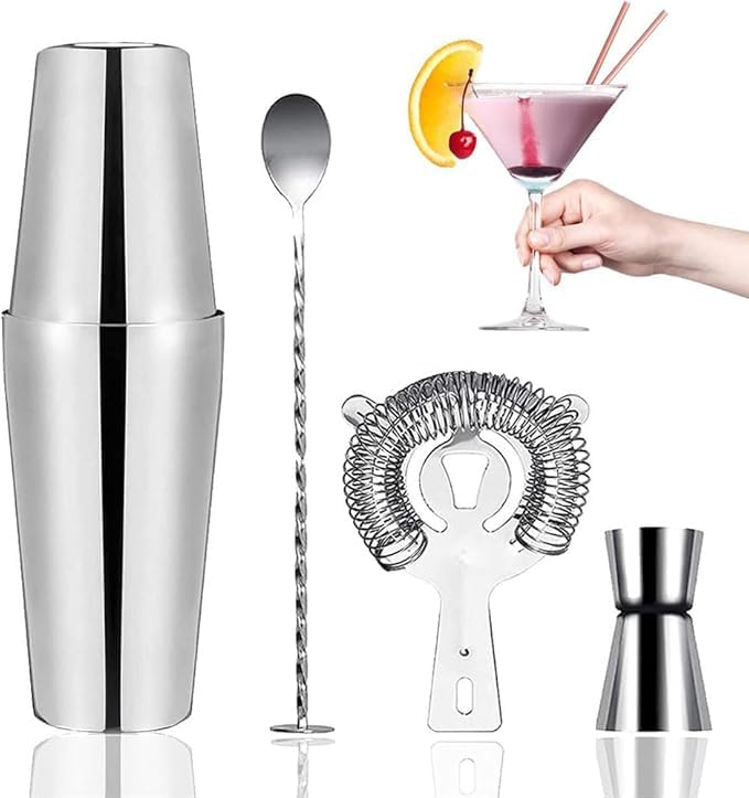 Generic - زجاجة شيكر للكوكتيل من الفولاذ المقاوم للصدأ، مجموعة مزج الكوكتيل، مجموعة إكسسوارات زجاجة شيكر بوسطن بسعة 750 ملليلترًا و500 ملليلتر، مع كوب عياري ومصفاة، مناسبة للمنزل، 5 قطع