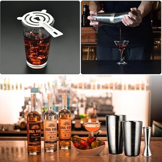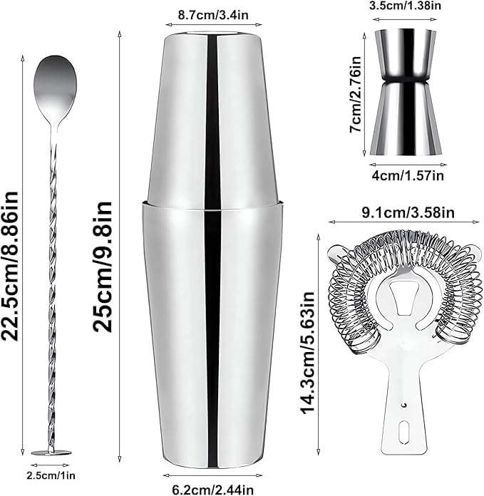 - محتويات العبوة: مجموعة شيكر كوكتيل مكونة من 5 قطع، بما في ذلك خلاط 500 مل/750 مل وكوب قياس 15/30 مل وملعقة خلط ومصفاة لصنع الكوكتيلات اللذيذة.