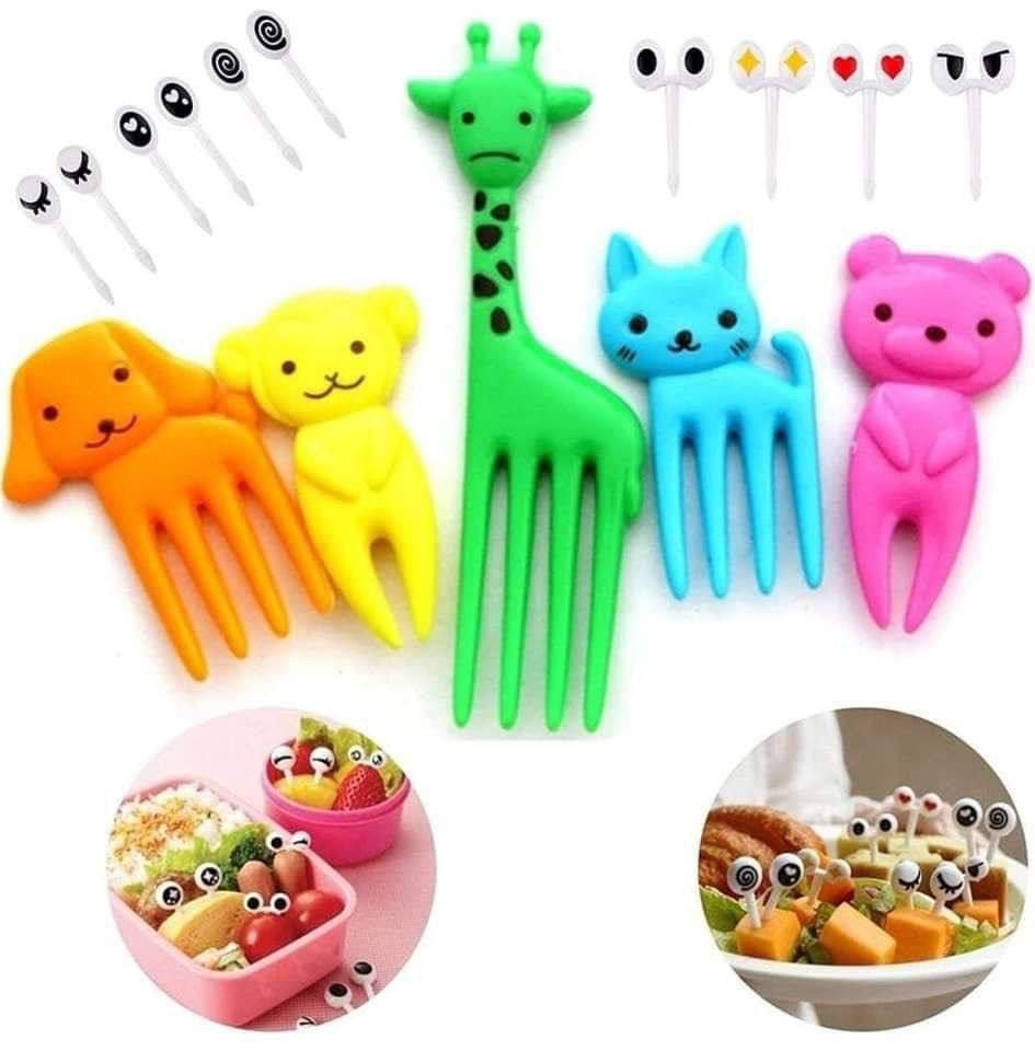 - ١) مجموعة متكاملة: طقم من الشوك الملونة على شكل حيوانات جذابة مع ٦ أوتاد تزيين للطعام بتصاميم عيون مختلفة