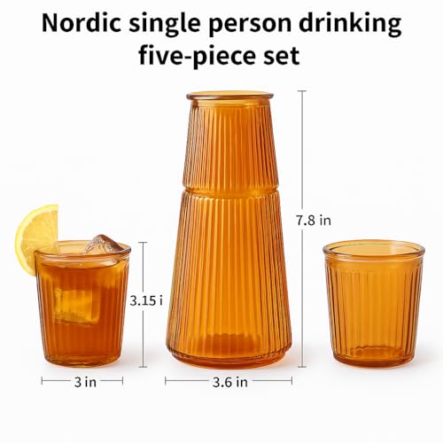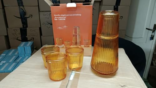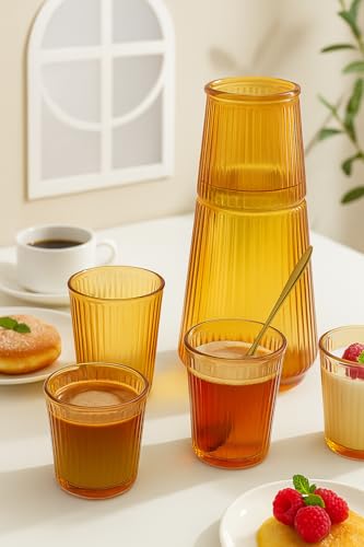 Generic - طقم مشروبات كهرمان نورديك مكون من 5 قطع - ابريق واكواب زجاجية مضلعة عصرية، هدية ادوات مائدة انيقة