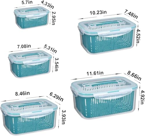 AREXOL - مجموعة صناديق تخزين بلاستيكية للثلاجة من 5 قطع مع سلة تصريف واغطية بقفل - حاويات محكمة الغلق خالية من البيسفينول ايه للحفاظ على الفواكه والخضروات والوجبات طازجة ومنظمة في الثلاجة