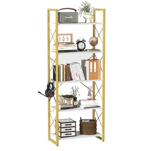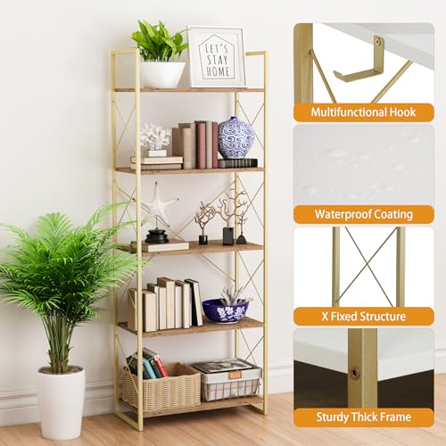 RKVPCNE - خزانة كتب طويلة من 5 ارفف، رف كتب خشبي صناعي ريفي عتيق قائم مع خطافات تخزين، حافظات كتب معدنية عريضة عصرية بارفف مفتوحة لغرفة النوم وغرفة المعيشة والمكتب والاقراص المدمجة