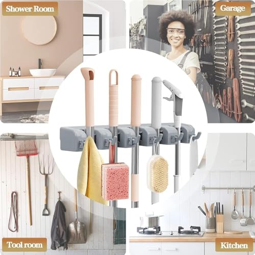 AREXOL - حامل مكنسة وممسحة بـ 5 فتحات، منظم يثبت على الحائط لأدوات التنظيف المنزلية مع خطافات قوية وتصميم مانع للانزلاق، رف شديد التحمل للمطبخ والحمام والمرآب