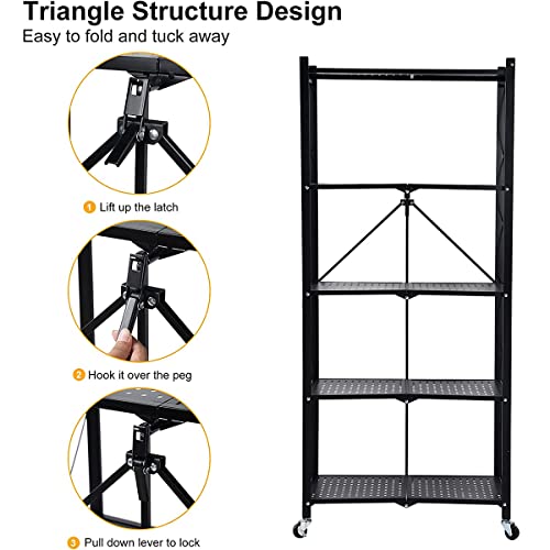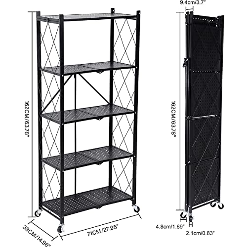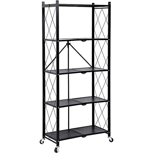 Rerkoudur - وحدة رفوف تخزين معدنية قابلة للطي شديدة التحمل من 5 طبقات مع عجلات تتحرك بسهولة، ارفف منظمة رائعة للمراب والمطبخ تحمل حتى 1250 باوند، اسود
