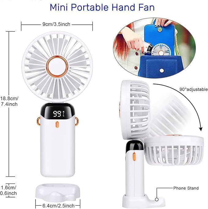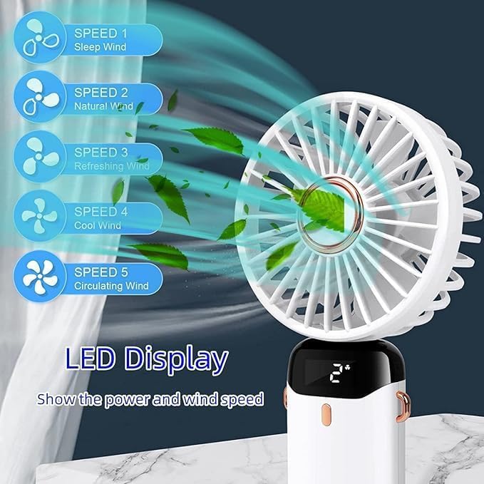 عام - مروحة يد محمولة بشاشة رقمية، بـ5 سرعات، قابلة لإعادة الشحن عبر USB، قابلة للطي بزاوية 90 درجة بتصميم عصري وهادئ، خيار مناسب للاستخدام في المنزل والمكتب والسفر بألوان متنوعة، أبيض