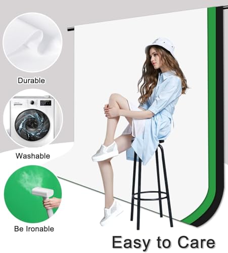 - 🌀【خلفيات قابلة للغسل والكي بثلاثة ألوان】: تتميز خلفية الصورة بصناعتها الممتازة ومتانة وثبات ألوان كما أنها قابلة للغسيل والكي. وتأتي الشاشة الخضراء بلون موحد وتعمل بشكل جيد مع تقنية الكروماكي. وتجعل الخلفيات السوداء السميكة التقاط الصور أسهل.