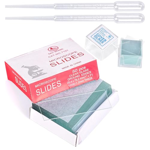 BUOSHUO - شرائح مجهر جاهزة من 50 قطعة 76 × 25 ملم، 100 قطعة من الأغطية الزجاجية، 20 × 20 ملم، مع قطرة، مناسبة لدروس علم الأحياء وإعداد العينات