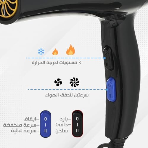 - تحكم دقيق في درجة الحرارة والسرعة: قم بتخصيص تجربة التصفيف الخاصة بك بسهولة. اختر من بين ثلاثة إعدادات لدرجة الحرارة وخيارين للسرعة لتناسب نوع شعرك والمظهر المرغوب فيه.