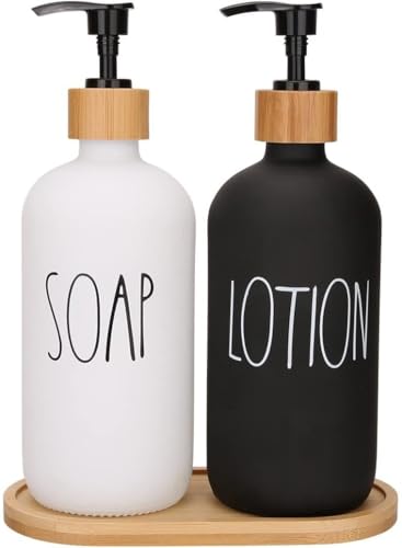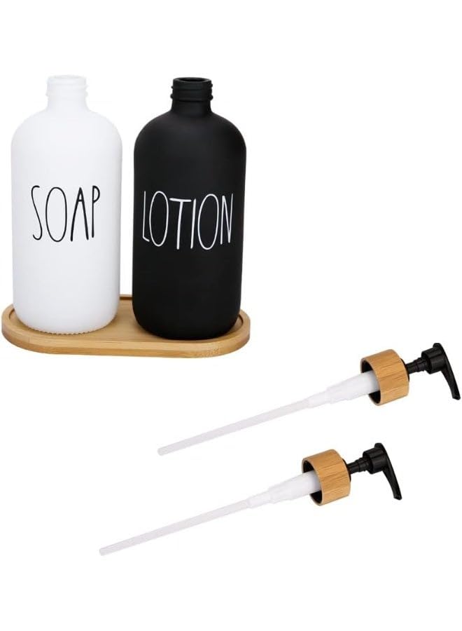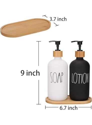 generic - موزع صابون لليدين سعة 500 مل، عبوة من قطعتين، موزع صابون زجاجي سائل قابل لاعادة الملء للحمام مع مضخة وصينية خيزران، مجموعة موزع صابون يدوي وطبق للمطبخ (اسود وابيض) - 142