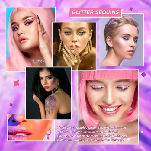 - نقوش غير منتظمة: رقائقنا الكبيرة متعددة الألوان غير منتظمة وصغيرة، عاكسة وذات تأثير هولوغرافي، يمكن أن تضيف لمسة منعشة لوجهك، عينيك، شعرك أو أظافرك. الرقائق رقيقة ويمكن أن تدوم أطول من رقائق الأظافر العادية إذا تم تطبيقها بشكل صحيح.