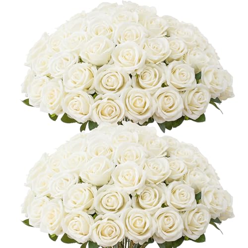 Jefuzh - زهور بيضاء اصطناعية بالجملة، ورود بيضاء صناعية حريرية واقعية مع سيقان لتزيين حفلات الزفاف، قطع زينة وسطية للطاولات، باقات العرائس يمكنك صنعها بنفسك، ديكور منزلي للمناسبات والحفلات من 50 وردة