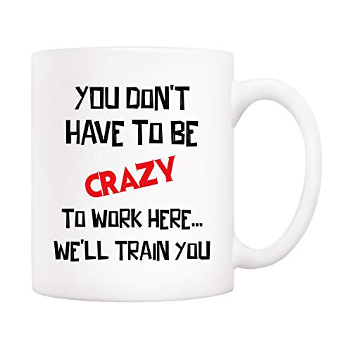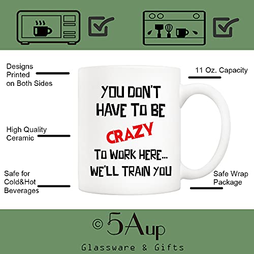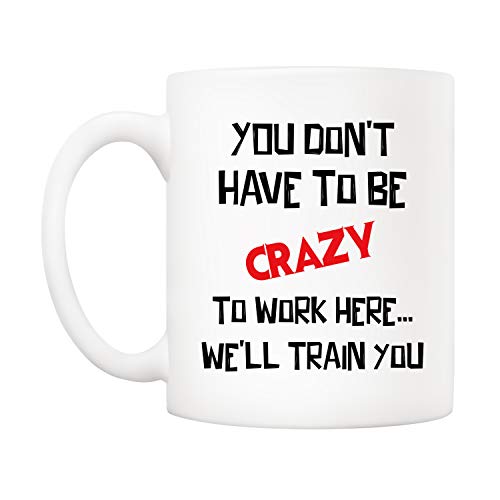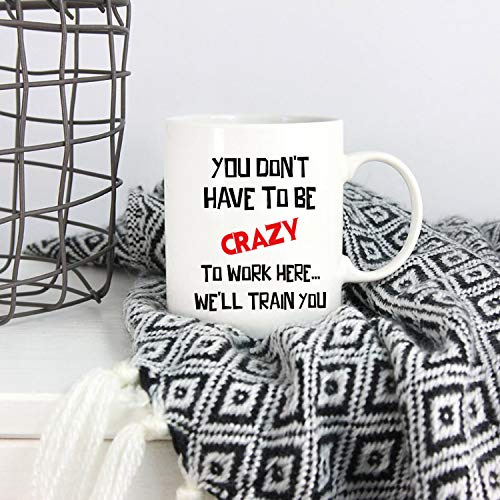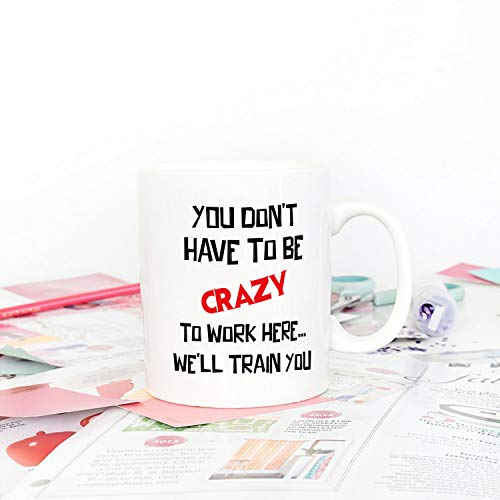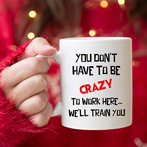 5Aup - مج قهوة لهدايا الكريسماس للمكتب مطبوع باقتباس مضحك «You Don't Have to Be Crazy Work Here… We'll Train You» بسعة 11 اونصة هدايا فريدة لاعياد الميلاد والاعياد الموسمية لزملاء العمل من 5 اوب سيراميك