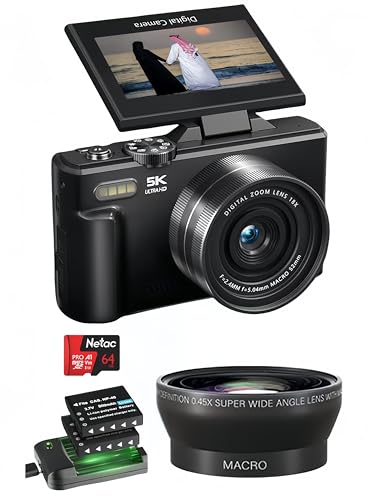 RedLeaf - كاميرا رقمية 5K UHD بدقة 75 ميجابكسل بهيكل معدني أسود وشاشة قابلة للطي بحجم 3 بوصة بزاوية واسعة وعدسة ماكرو وبطاقة 64 جيجابايت وبطاريتين للتصوير الفوتوغرافي ومدونات الفيديو