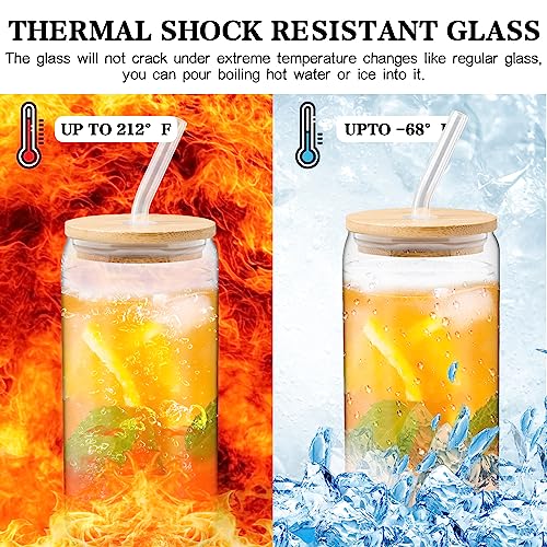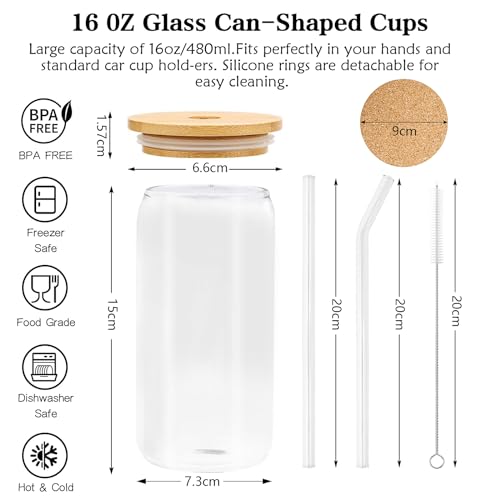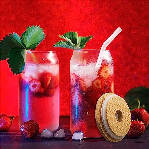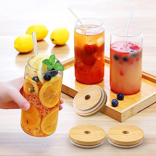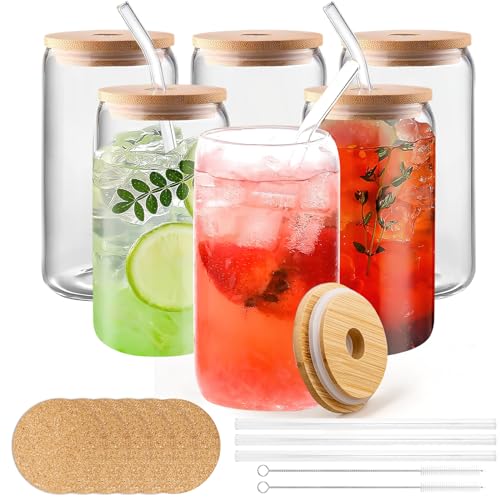LYCN - اكواب شرب زجاجية بغطاء من الخيزران، سعة 16 اونصة/455 مل، اكواب زجاجية مع ماصة زجاجية، اكواب شرب شفافة لطيفة للقهوة المثلجة والبوبا والسموذي والكوكتيل من 6 قطع