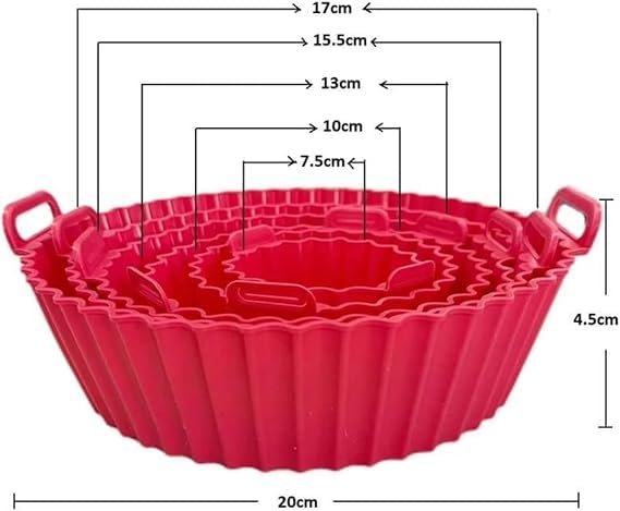 - المقاسات الكبيرة (7.5 انش، 6.5 انش، 5.5 انش، 5 انش، 4 انش، 3.5 انش) مما يجعلها رفيقة مطبخ متعددة الاستخدامات. نحن ندعم جودة حشوات المقلاة الهوائية الخاصة بنا مع ضمان الرضا بنسبة 100%. تم تصميم حشوات المقلاة الهوائية المصنوعة من السيليكون عالي الجودة لتحمل درجات الحرارة العالية وهي آمنة للغسل في غسالة الأطباق. يمكنك الاستمتاع بالطهي الخالي من الإجهاد وراحة البال التي يمكنك طهيها بأمان.