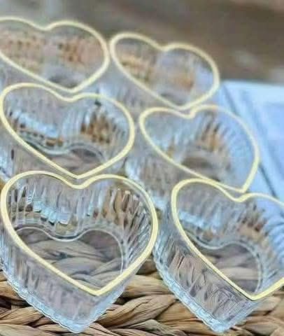 - تصميم أنيق على شكل قلب: مجموعة من 6 أطباق تقديم زجاجية بتصميم قلب رومانسي مع حواف ذهبية فاخرة تضيف لمسة جمالية عصرية لطاولتك