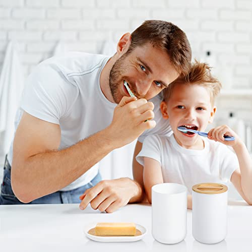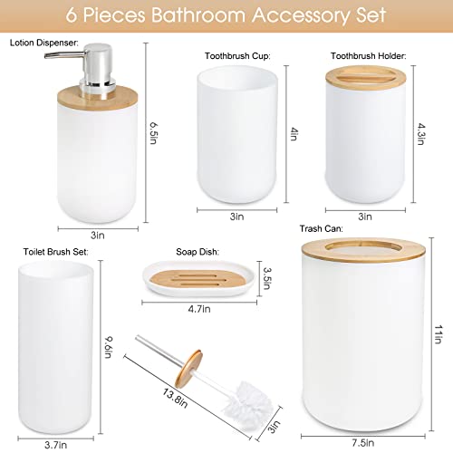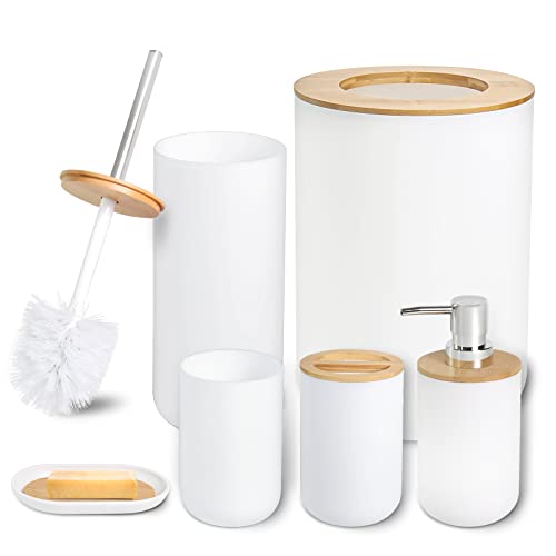 DESIYUE - إكسسوارات حمام من البامبو، طقم يشمل موزع صابون وحامل فرش أسنان وكوب شطف وصبانة وسلة مخلفات وفرشاة مرحاض، طقم أدوات حمام عملي لغرفة الغسيل المنزلية، 6 قطع (أبيض)