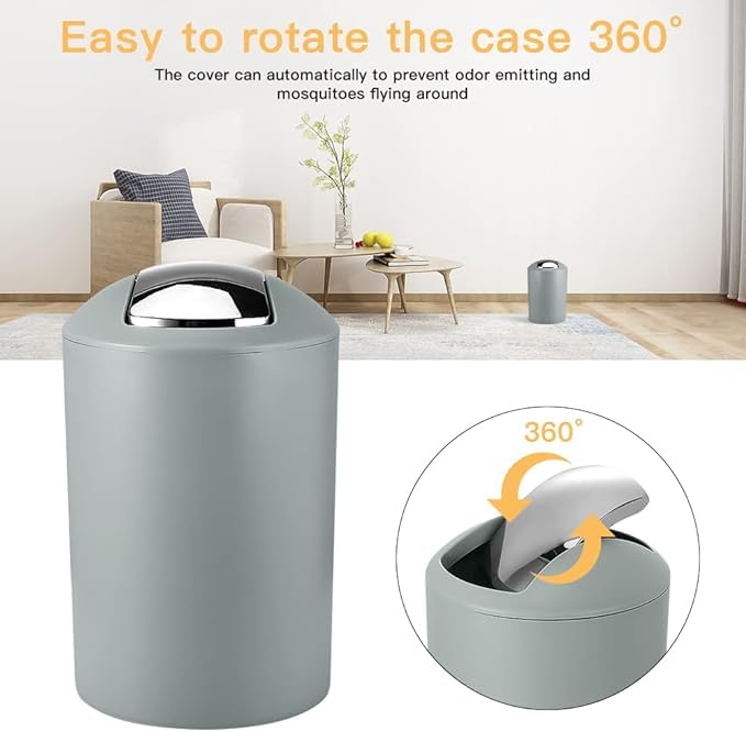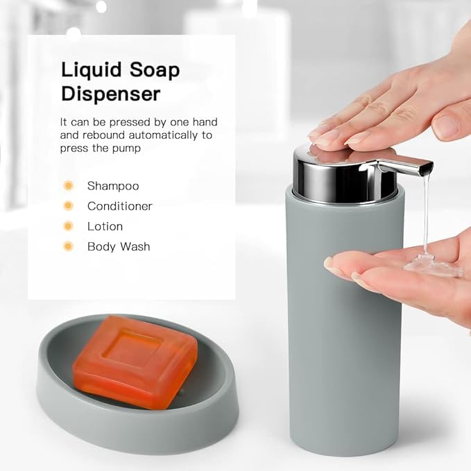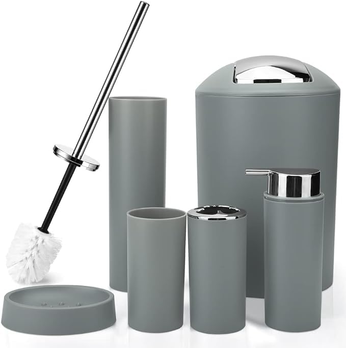 Generic - مجموعة اكسسوارات الحمام من البلاستيك مكونة من 6 قطع مع موزع صابون وحامل فرشاة اسنان وكوب وطبق صابون وحامل فرشاة المرحاض وسلة مهملات وهدايا الانتقال لمنزل جديد وديكور سطح الطاولة (رمادي)