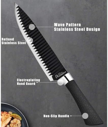 - تصميم مسنن مبتكر: السكاكين مزودة بحواف مسننة حادة تسهل تقطيع اللحوم والخضروات والفواكه بدقة وسلاسة دون بذل مجهود كبير