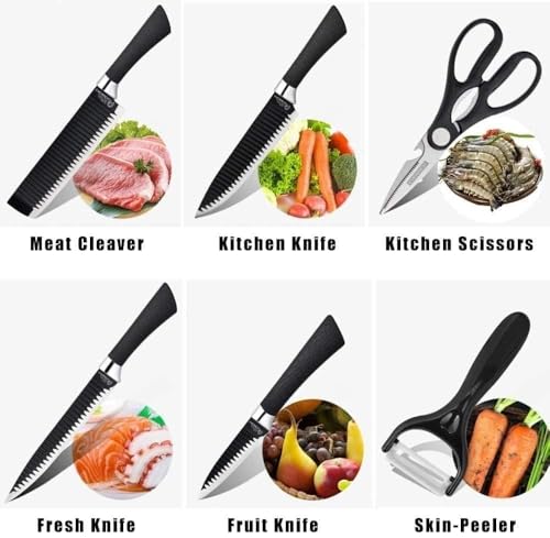 Generic - طقم سكاكين مطبخ 6 قطع مع مقص ومقشرة، شفرات مسننة من الفولاذ المقاوم للصدأ، مقابض سوداء، أدوات تقطيع احترافية