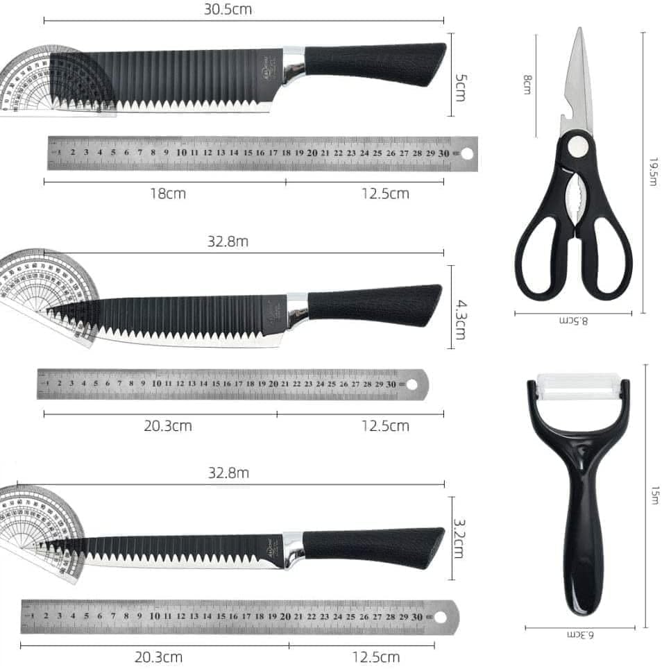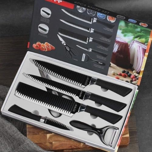 - طقم سكاكين متكامل: يتضمن 6 قطع - 4 سكاكين مسننة بأحجام مختلفة ومقص متعدد الاستخدامات ومقشرة خضروات لتلبية جميع احتياجات المطبخ