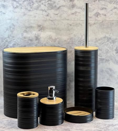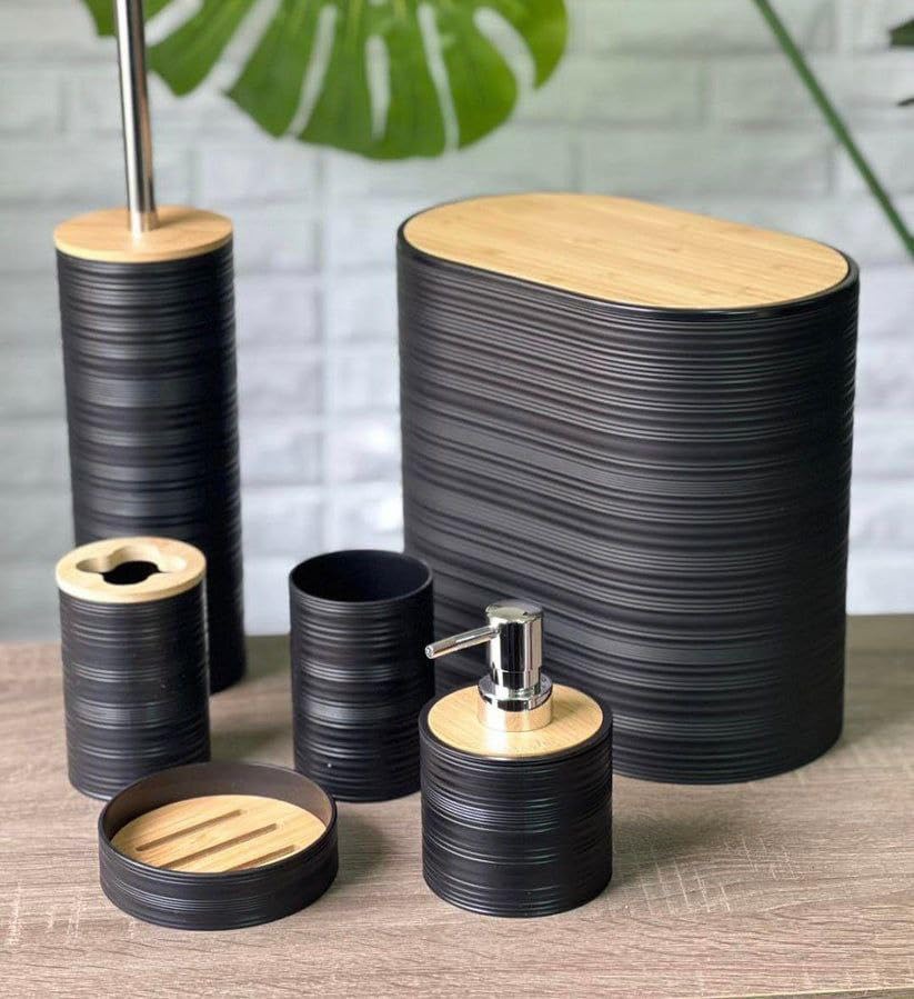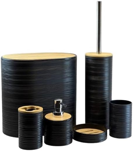 Generic - طقم حمام بيضاوي 6 قطع – شامل باسكت بغطاء خشبي وفرشة تواليت وحامل فرش الأسنان وصبانة وديسبنسر شاور وكوب متعدد الاستخدام (اسود)
