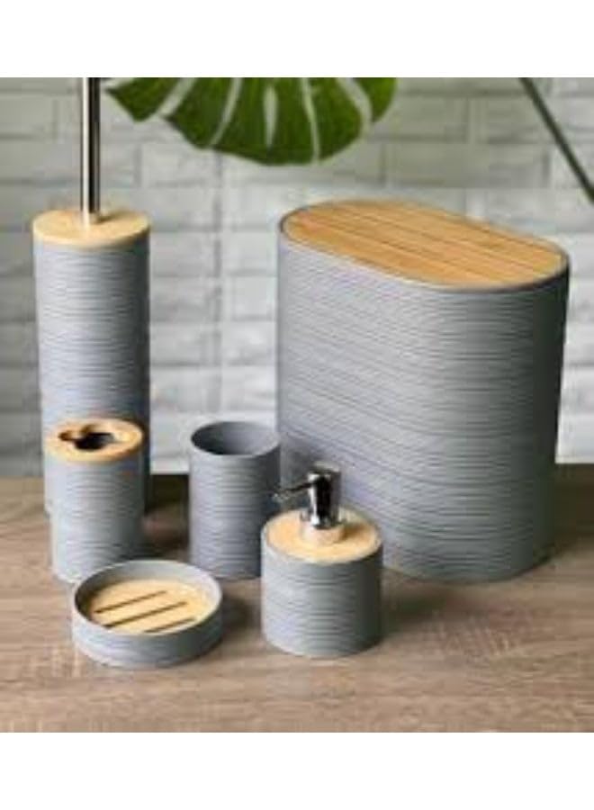 generic - طقم حمام بيضاوي 6 قطع - سلة مهملات بغطاء خشبي وفرشاة مرحاض مع حامل وموزع صابون وحامل فرشاة أسنان وحامل أدوات حلاقة وطبق صابون بتصميم أنيق وعصري، رمادي