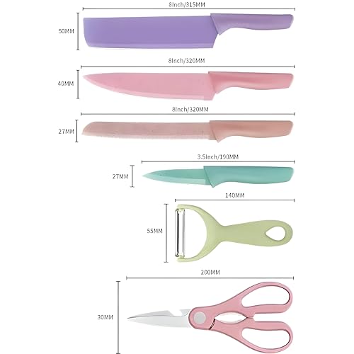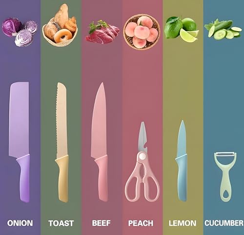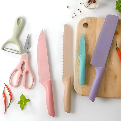 - مجموعة متكاملة لجميع احتياجات المطبخ تشمل سكين ساطور، سكين خبز مموج، سكين فاكهة، سكين تقشير، مقشرة سيراميك، ومقص مطبخ متعدد الوظائف لتغطية كل مهام التقطيع