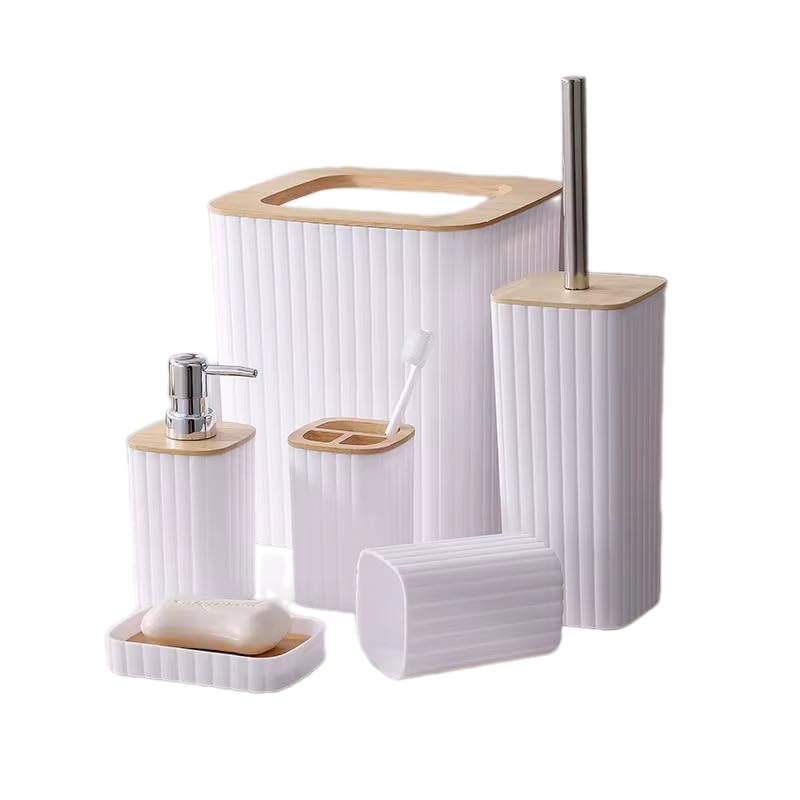 Generic - طقم حمام مربع مضلع، 6 قطع، أبيض مع غطاء خشبي، حامل صابون، موزع، حامل فرشاة، سلة مهملات