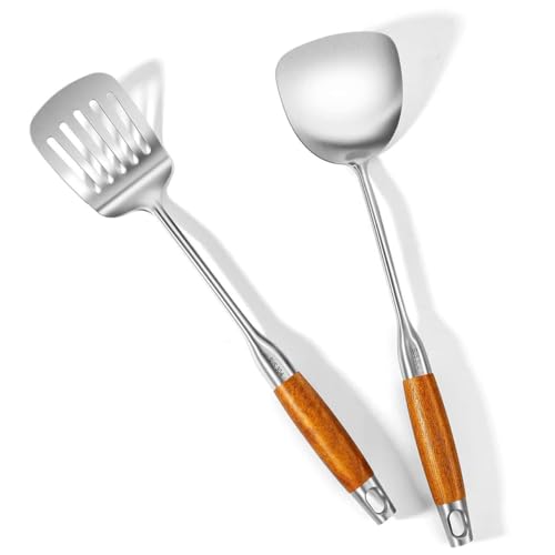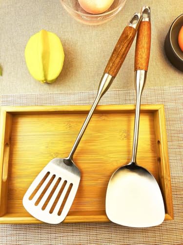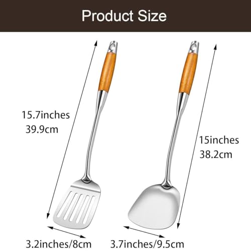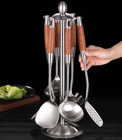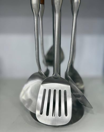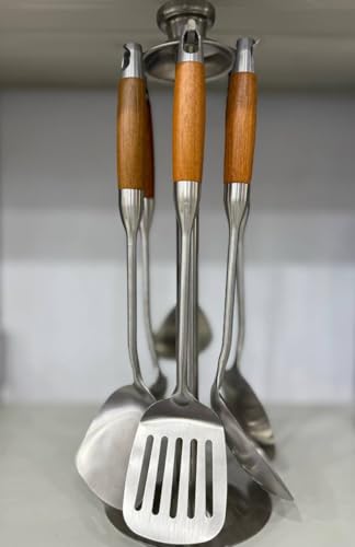 Generic - طقم ملاعق طهي 6 قطع من الستانلس ستيل – مقابض خشبية طويلة + حامل أنيق